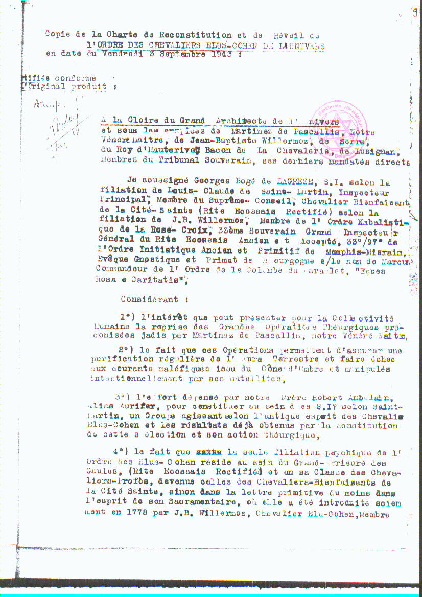 van de Elus-Cohen op 3/9/1943 door Robert Ambelain en Geoges Bog� de Lagr�ze ( deel 1 )